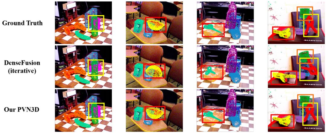 图 3 可视化了在YCB-Video数据集上的一些预测结果,PVN3D 比先前方法更准确。