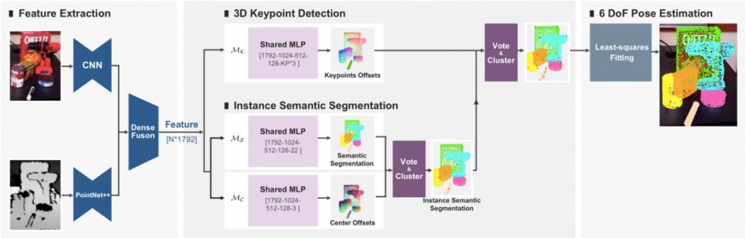 这是一种两阶段方法,在检测出物品的 3D 关键点之后使用最小二乘法拟合出位姿参数。具体而言,输入RGBD 图像,通过特征提取模块融合表面特征和几何信息获得逐点特征。这些特征被送至一个 3D 关键点检测模块以预测逐点到 3D 关键点的偏移(以投票出 3D 关键点)。