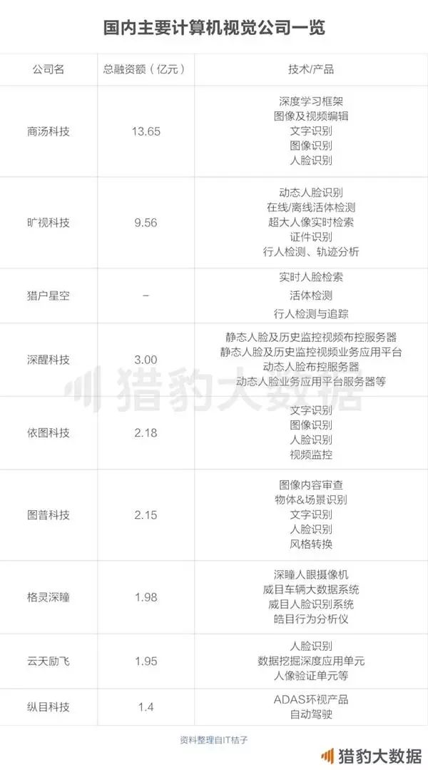 计算机视觉:通过计算机视觉算法及软硬件为客户解决人脸识别、图像识别、视频分析等需求的解决方案提供商。如以下公司↓