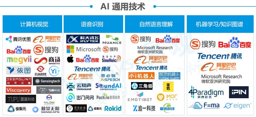 自然语言理解:通过自然语言处理/语义分析等技术提供智能聊天、对话、问答、客服机器人的技术及软件服务商:搜狗、百度、微软、阿里巴巴、腾讯、小i机器人、图灵机器人、三角兽、来也、追一科技、EMOTIBOT、智言科技、蓦然认知、分音塔科技、新译科技。