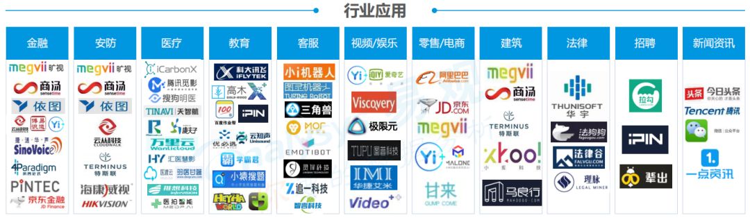 行业应用:将AI通用技术应用于金融、安防、建筑、医疗、教育、零售/电商、视频/娱乐/社交等领域,或传统行业通过研发AI技术赋能自身业务以实现降本增效、提升用户体验的公司。