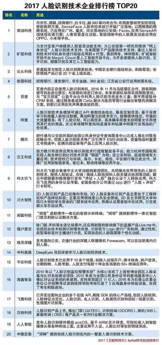 以下为《互联网周刊》与eNet研究院评选的2017年度人工智能企业百强