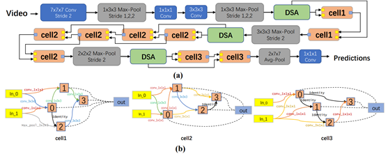 RAAR3D网络包含级联的时空注意力模块DSA和重组的不同结构单元cell1, cell2和cell3。DSA模块包含时间域注意力机制和空间域注意力机制。其中时间域注意力机制主要是捕获手部和手臂的运动信息,而空间域注意力机制则捕获他们的位置信息。捕获的不同域特征最后串联并通过残差结构进行融合。