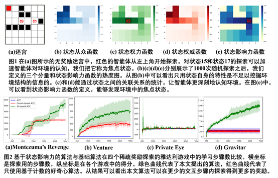 基于对状态影响力的定义,我们设计了应用Q-Learning和A2C的通用强化学习框架。并应用到迷宫格与雅达利游戏等带有稀疏奖励信号的复杂探索任务中,得到了比只用状态自身信息设计内部奖励的相关方法更好的效果。