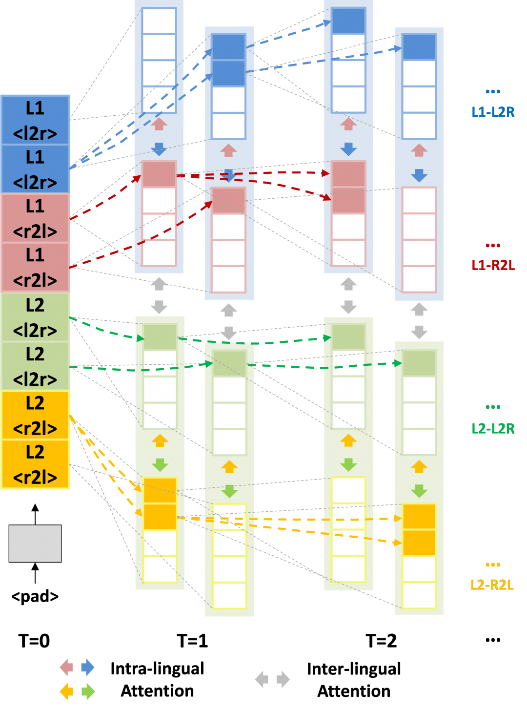 1)同步交互式多语言注意机制模块。让每一路的目标序列分别与语种内和语种间的历史信息、未来信息共4类信息执行注意力计算,得到4类注意力隐状态,再通过一个融合机制得到最终的隐状态输出。