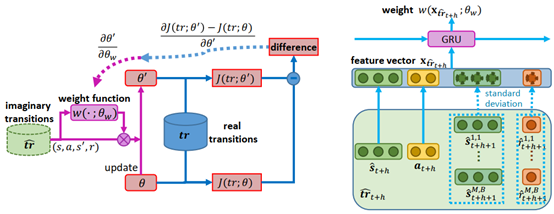 我们的工作考虑,根据每个生成样本对训练过程的影响来调整权重,从而,在抑制模型误差对训练过程的负影响的同时,最大化地利用生成样本。我们构建以下流程来调整权重:针对每个生成样本,首先,使用它来更新价值和策略网络;然后,在真实数据上计算神经网络更新前后损失值的变化;最后,根据损失值的变化调整该样本的权重。为了高效地实现这一权重调节机制,我们构建了一个权重预测网络,并按照上述流程对该网络进行训练:使用权重预测网络对一批生成样本进行权重预测,使用加权后的样本更新价值和策略网络,以更新前后损失值的变化作为优化目标,按照链式法则计算梯度并更新权重预测网络。