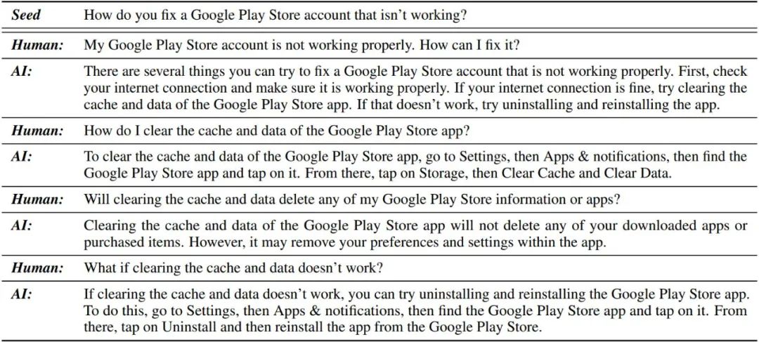 自聊天的过程是训练内容的基础,为了让 ChatGPT 能够有效生成数据,研究人员应用一个模板来定义格式和要求,让 ChatGPT 的 API 持续为对话双方生成抄本,直到达到自然停止点。对话以「种子」为中心,「种子」可以是一个问题,也可以是设置聊天主题的关键短语。