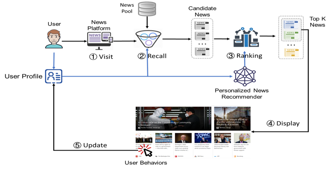 由于每天都有大量新闻产生和发布,用户难以在有限的时间内从大量新闻中找到自己感兴趣的内容,面临严重的新闻信息过载。个性化新闻推荐可以根据用户的个人兴趣对候选新闻进行排序和展示,是提升用户在线新闻阅读体验的一项重要技术。目前,新闻推荐已广泛用于 Microsoft News 等诸多在线新闻平台中。