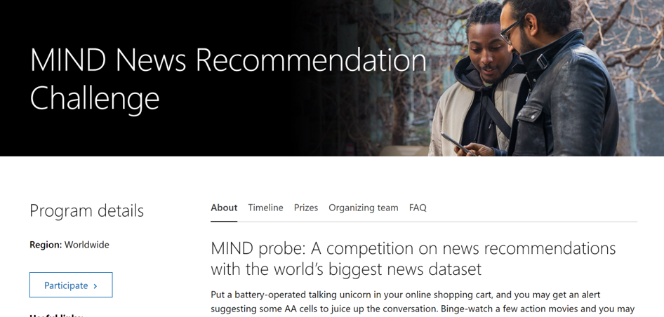 同时,为吸引全球学术界和工业界的研究人员一起研究和探讨个性化新闻推荐方法,微软亚洲研究院基于 MIND 数据集举办了一个 MIND 国际个性化新闻推荐竞赛,吸引了超过200支世界各地的队伍参赛。目前,该竞赛平台继续开放,欢迎大家提交自己的实验结果。