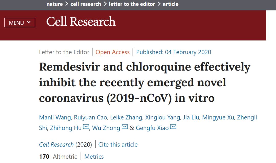 近日,中国科学院武汉病毒研究所/生物安全大科学研究中心与军事科学院军事医学研究院国家应急防控药物工程技术研究中心开展联合研究,在抑制2019新型冠状病毒(2019-nCoV)药物筛选方面取得重要进展。相关研究成果以“Remdesivir and chloroquine effectively inhibit the recently emerged novel coronavirus (2019-nCoV) in vitro”(《瑞得西韦和磷酸氯喹能在体外有效抑制新型冠状病毒(2019-nCoV)》)为题发表在中国自主知识产权的国际知名学术期刊Cell Research(《细胞研究》)上。