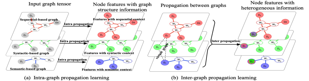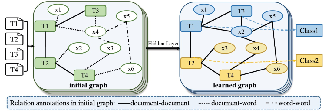 图9 基于GNN的模型。初始图的不同取决于图的设计方式。给出一个例子,在文档与文档、文档与句子、词与词之间建立边