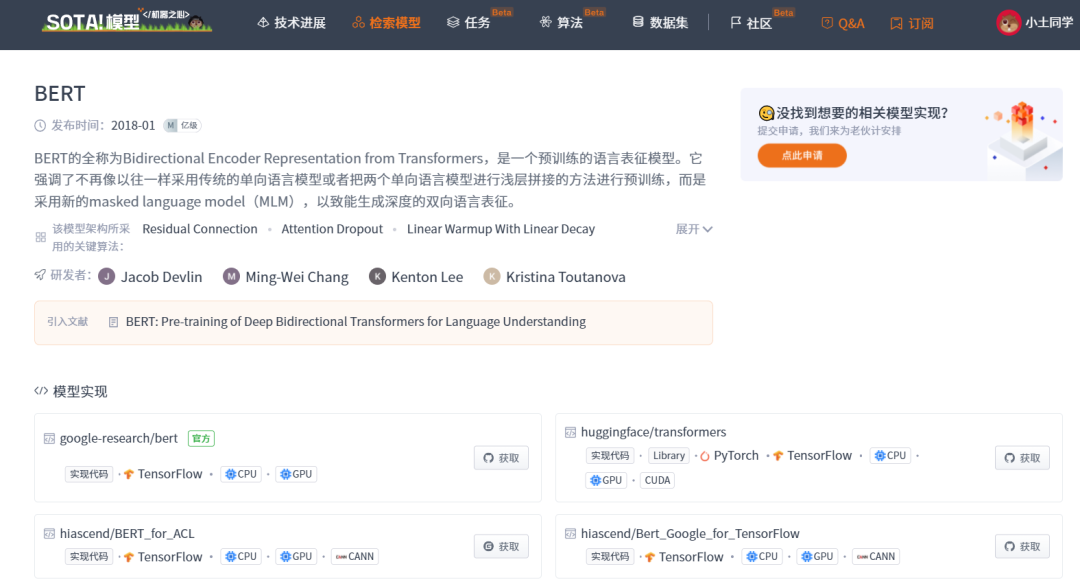 | BERT | https://sota.jiqizhixin.com/models/models/1d27a74a-8668-4d64-9615-ce889b88700b 收录实现数量:7 支持框架:TensorFlow、PyTorch 等 |