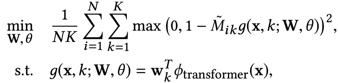 2)作为神经匹配器的deep Transformer。经过SLI,原来难以解决的XML问题演变成了一个可行的XML子问题,其输出空间大小为K,是一个非常小的数。应用deep Transformer将每个文本实例映射到指定的相关集群。构建分类器: