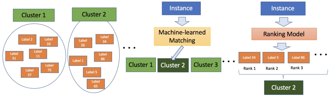 图7 X-Transformer框架。首先,语义标签索引减少了庞大的输出空间。然后在XMC子问题上对Transformer进行微调,该子问题将实例映射到标签集群。最后,在集群和转化器的输出上有条件地训练线性排名器,以便在预测的集群中对标签进行重新排名