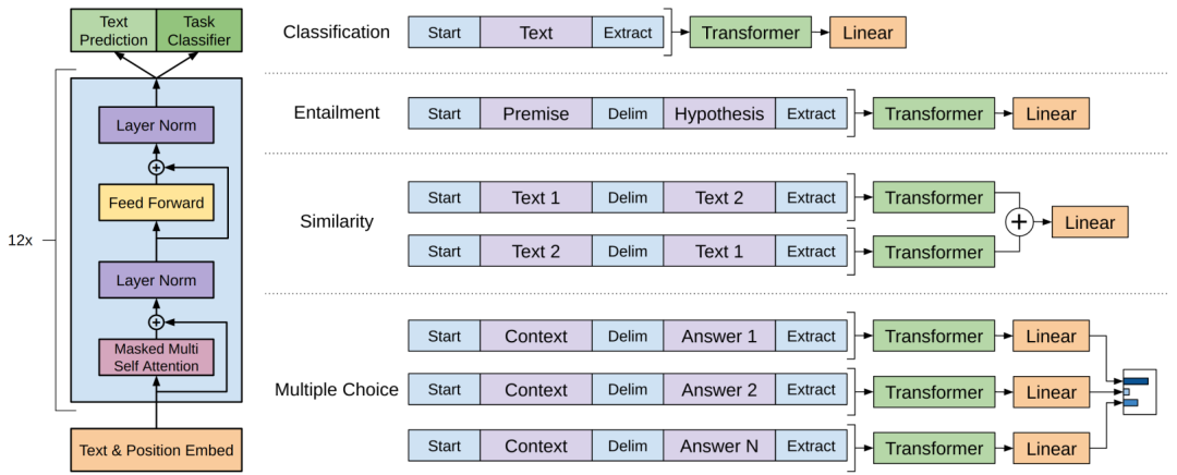 图3 左)GPT中使用的Transformer结构和训练目标。(右) 输入在不同的任务上进行微调的转化。将所有结构化的输入转化为标记性的序列,由预训练模型处理,然后是一个线性+softmax层