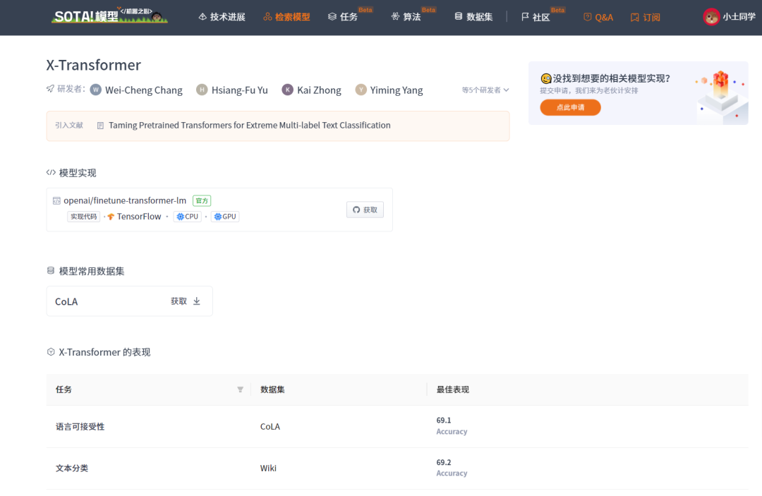 当前 SOTA!平台收录 X-Transformer 共 1 个模型实现资源。