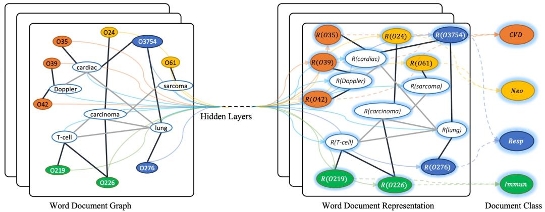图10 文本GCN的示意图。样本取自Ohsumed语料库。以 "O "开头的节点是文档节点,其他节点是词节点。黑色粗边是文档-词的边,灰色细边是词-词的边。R(x)表示x的表示(嵌入)。不同的颜色表示不同的文档类别。CVD:心血管疾病,Neo: 肿瘤,Resp: 呼吸道疾病,Immun: 免疫学疾病