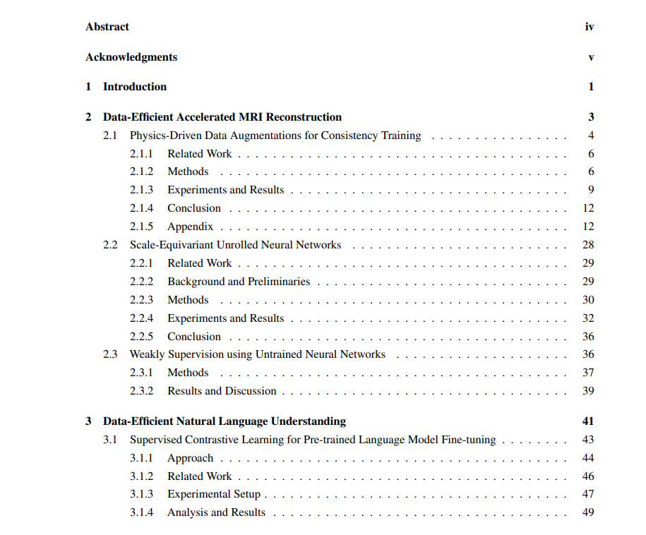 我们首先描述了我们在构建数据高效的机器学习方法方面的工作,通过物理驱动的一致性训练增强、尺度等变展开神经网络和使用未经训练的神经网络弱监督来加速磁共振成像(MRI)重建。然后,我们描述了我们在构建用于自然语言理解的数据高效机器学习方法方面的工作。特别地,我们讨论了一种监督对比学习方法用于预训练的语言模型微调和一种大规模数据增强方法来检索领域数据。与有效管理训练数据相关,我们讨论了我们提出的用于类表单文档gather的信息提取系统,并重点讨论了训练数据管理和相关工具中经常被忽略的方面。我们强调了有效管理训练数据的重要性,表明它至少与机器学习模型在真实数据集的下游提取性能方面的进展一样关键。最后,为了改进各种类型数据的嵌入表示,我们研究了具有异质曲率的空间。我们展示了混合曲率表示为图和词嵌入提供了更高质量的表示。此外,我们还研究了如何将Wikidata知识图谱中的实体嵌入到一个抽象的文本摘要模型中,以增强其真实性。