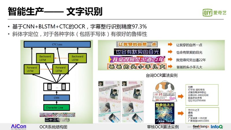 AI 应用在文字识别,可以对字幕进行文字识别和语义理解,对审核图片、视频中的不合规文字信息进行识别和反垃圾过滤。文字识别主要用的技术是双向 LSTM 加上 CTC,在网上有很多开源,大家可以找到。文字识别在黑白文档中可以达到 98% 的识别率,但在视频中同样有很多挑战,比如影视剧的字幕比黑白文档更难识别,因为字幕不但背景复杂,而且字体多样,有很多装饰的效果,每个字的间距可能挤在一起。而在内容审核任务中,用户为了反机器识别,图片文字甚至已经不是横着写了,有时候斜着写,甚至弯曲着写,手写体的草书,中英文数字混写,大大提高了识别的难度。