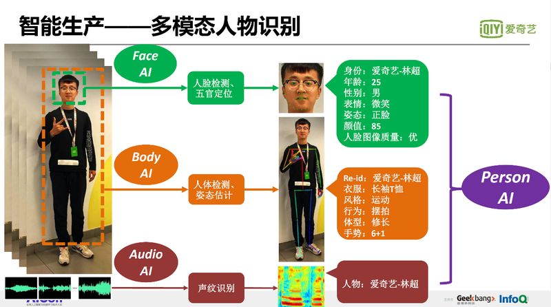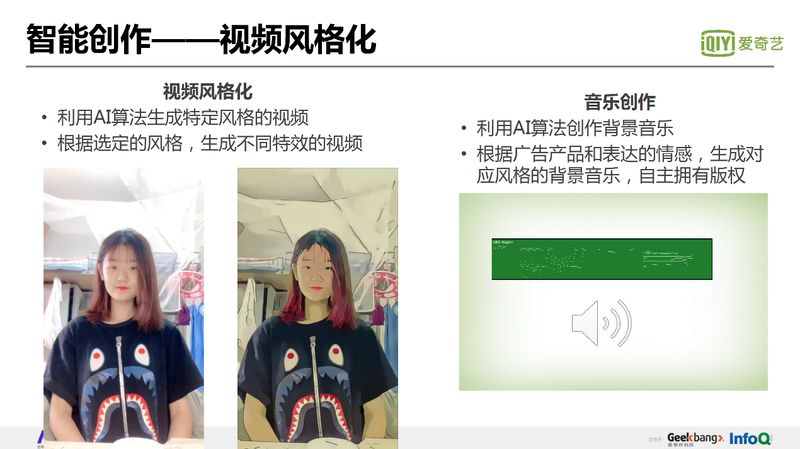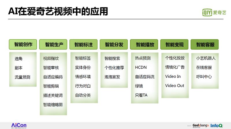如上图所示,爱奇艺从创作、生产、分发、变现,到客户体验的每个环节,都有了 AI 的用武之地。