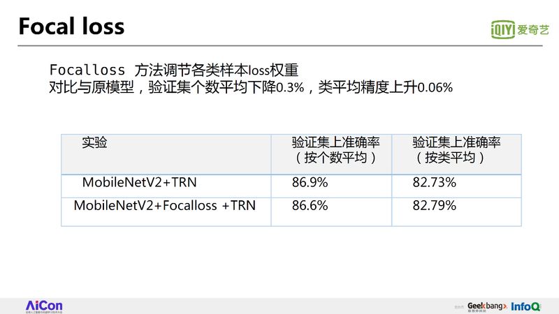 对于小样本和易错分的类别,Focal loss 是不是很有用,我们也做了实验。第一行表示没用 Focal loss,第二行是用 Focal loss,按个数平均的精度没提高,反而降了 0.3%,但是按类平均精度提高了 0.06%, 所以说 Focal loss 调整能力对解决这个问题效果很有限,仅微小的提高了分类器的推广性能。