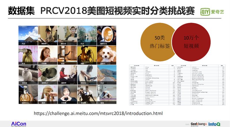 最后是美图短时频分类 mtsvrc2018 数据集,是 UGC 短视频实际应用非常有代表性的数据集,有 50 个类,10 万个短视频,50 个标签。下面我们将在 mtsvrc2018 数据集上,进行短视频分类方向的数据分析、实验比较。在 mtsvrc2018 数据集上,实验的评价指标,第一个是精度要高,第二个,速度要快。最终评论指标看提交的算法性能点和蓝色参考点的距离长短,越靠近蓝色原点,表示性能越好。