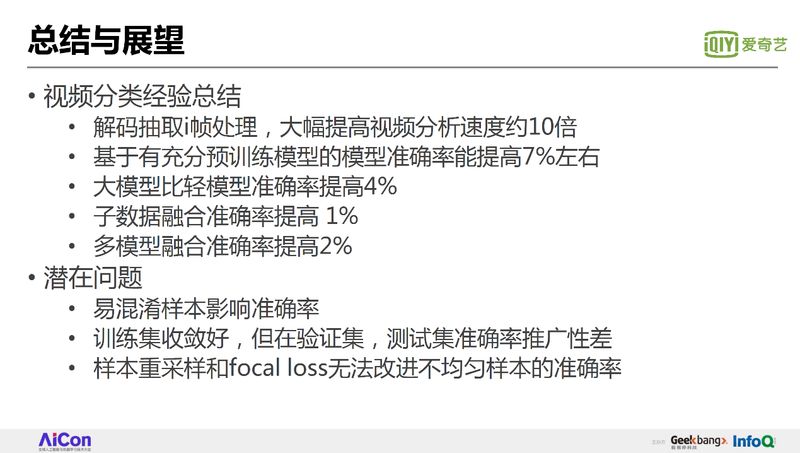 发现的潜在问题,也是整个业界有待解决的研究问题。第一个是脏数据问题。因为易混淆样本,人工标注的数据质量不可能很准。人可以通过不断总结,不断重复找到正确规律,但是深度学习能否从含有噪声的脏数据中找到真相?第二点,推广性问题。训练时,训练集收敛精度达到 99%,但是验证集精度是 88%-90%,下降了 10%,而测试集的精度又下降 4 个点,到了 82% 左右。由于训练集的过拟合、训练、测试不同数据集之间分布不同,模型推广到陌生数据集后性能差异很大。增加训练的数据集大小,推广性更好。复杂模型的推广性通常比简单模型的性能要更加稳定。但是对于给定的训练和验证数据集,如何有效提高推广性?第三个是小样本数目不均衡问题。调整各类样本的采样率,不能提高精度。调整类别权值的 focal loss 效果还不理想。