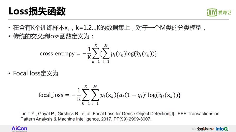 另外,除了网络结构之外, 收敛最优化的准则 Loss 函数也很重要。通常有 均方差 MSE Loss,还有交叉熵 Loss,交叉熵主要是衡量预测的置信度概率分布与真实概率分布间的差异。在做图像分类时,每类别的样本数目不同,各类别的权重和预测精度也不一样。为了改进识别精度低、样本数比较小的样本,何恺明提出了 Focal loss 方法。这跟 cross_entropy 有什么差别?为什么要加这项 (1-qi)r?qi 是分类器输出的第 i 类的概率,如果这个概率很低的话,那么 1-qi 很大,相当于把这一个样本的精度权重贡献加大,ai 用于调整样本数目的权重,通过这个方法来提高判定函数的整体识别精度。