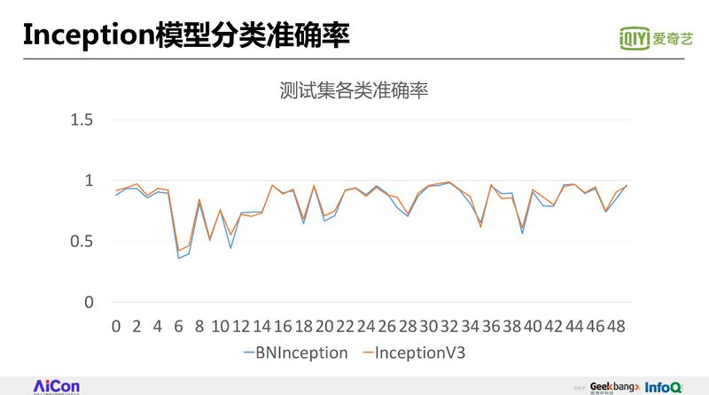 这是使用 Inceotion 模型的初始分类结果,横轴是 50 个类别,纵轴是精度。可以看到不同类别的精度波动非常大,好的到 90%,差的只有 30%-40% 的精度。有的类别精度为什么很低?有两部分原因,第一,这个类别很难识别,比如里面定义了风土人情和风景,这两个类别非常相似。风土人情中的赛龙州,它属于风土人情的人文活动,但是龙舟之外还会拍到两岸的景色,这很容易混淆。第二,这个类别的样本数也非常少,我们画了一张图,发现精度比较低的类别都是样本非常少的类别。这张图还比较了两个算法, Inception V3 橙色曲线的精度比 BNInception 模型的蓝色曲线精度更高一些。