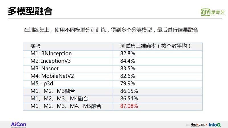 另外我们还使用了多模型融合的方法,在相同数据集上训练了多个模型,将 4 个模型进行融合后精度从 84% 提高到 86.5%,5 个模型融合起来可以达到精度 87%,这个精度已经达到了第一名的成绩。但速度还是有差距的,第一名的速度非常快,我们如果使用 5 个模型,要多花 5 倍的时间,除非让 5 个模型并行,才能达到很好的速度。