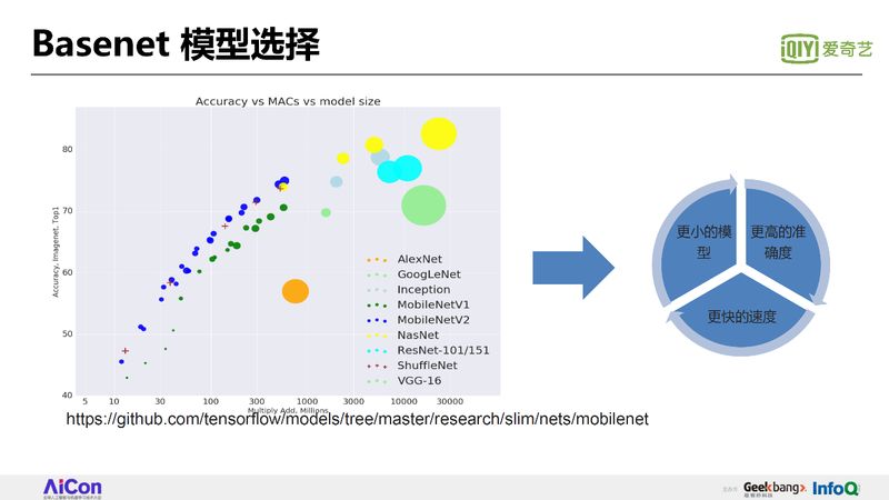 第二是选模型,选模型就是选择用来特征提取的神经网络。Github 上有个公开的模型性能评测,如上图所示,横轴代表了乘加计算量,纵轴代表精度,大家看到最好的模型是 NasNet、Inception、ResNet 等,优于 mobileNet,VGG-16 等。