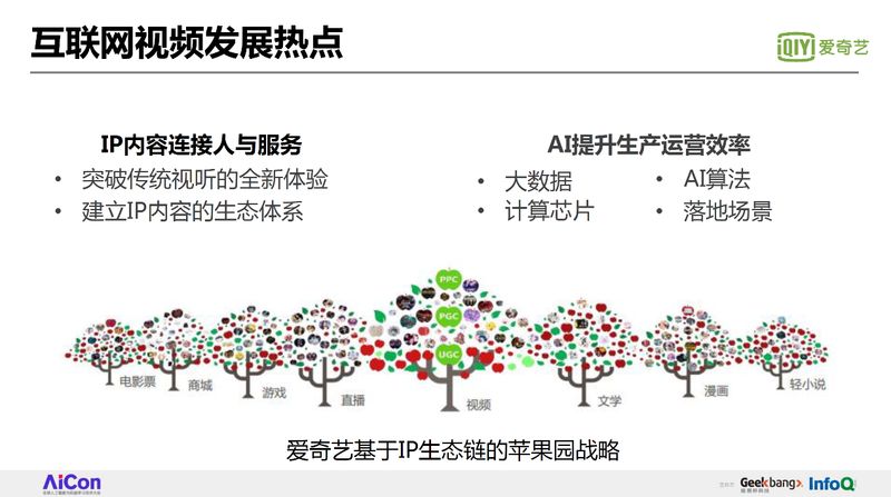 下面介绍我们这个行业在做什么事。爱奇艺视频是一个苹果园生态,核心是提供视频内容给用户观看,上游有文学、漫画,下游有票务、商城、游戏、直播等内容衍生品,围绕 IP 打造成了一个从创作,观看,到消费变现的闭环生态系统,为用户提供全方位的娱乐服务。这其中最重要的是 IP,通过 IP 内容连接人与服务,通过 AI 提升极致的视听体验效果和各环节的生产运营效率。