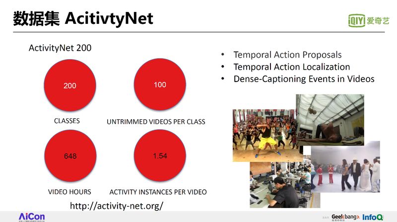 第三个是 ActivityNet 数据集,该竞赛定义了人物相关的事件定位、事件分类、事件描述等识别任务,有二百个类别,每个类大概有一百个视频,时长 648 个小时。