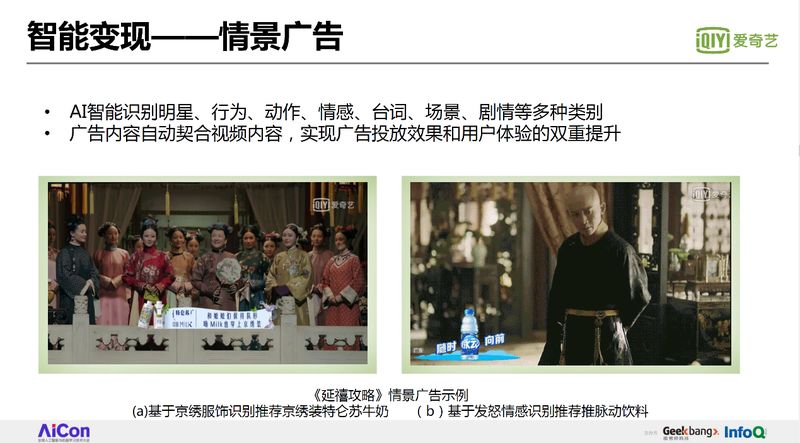 AI 还可以用于视频内容变现,将用户观看流量最后转化为商业价值。比如情景广告,根据画面中的明星、台词、场景等类别,推荐与内容匹配的广告,提高广告投放关联性效果与用户观看的趣味性。如左图所示,系统识别了人物的京戏服装,推荐了京绣装的特伦苏牛奶。右图中,进行情景识别出皇上生气、魏璎珞吓得腿软的镜头,所以它的广告词配的特别有趣:腿软了,随时“脉动”向前,给用户展示脉动饮料来鼓劲。