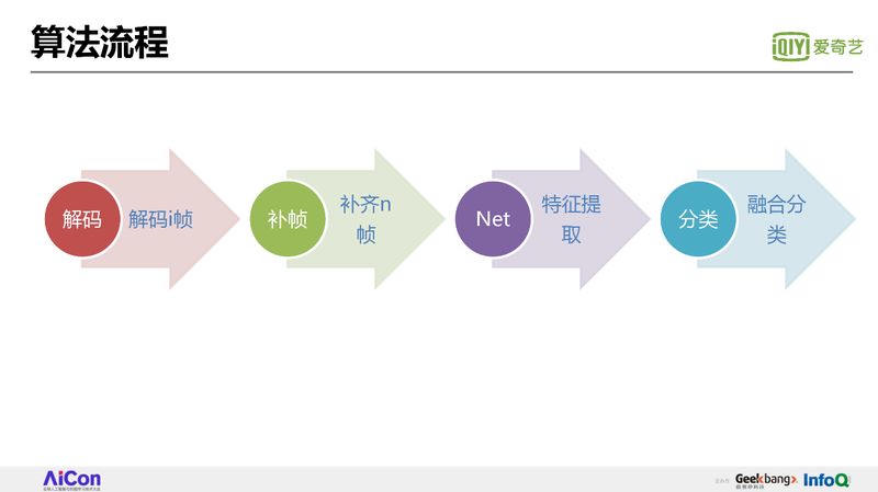 我们针对美图短视频分类数据集做了一些实验。算法流程上,首先把视频的图片解码出第二,凑齐 N 帧,保证每个视频有相同的采样帧。第三,提取特征,第四,融合多张图片的分类结果。想要要提高速度,每个模块速度都要快,要提高精度,可以在数据的预处理、模型训练,还有后处理融合这几块来下工夫。