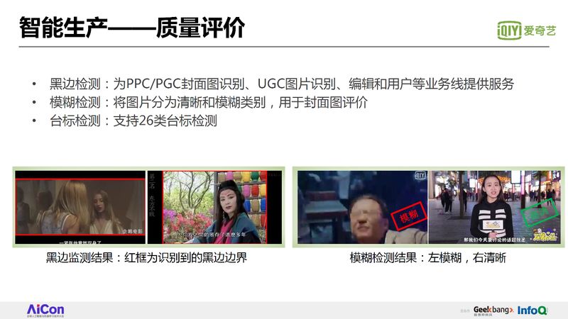 AI 还可以用于视频质量评估,包括黑边检测、模糊检测、马赛克检测、音频一致性检测等,保证发布视频的质量。比如选择视频海报图,需要自动选择无黑边、清晰、美观的图片发布。再比如,多个用户上传了多个版本但分辨率和质量不同的视频内容,通过内容质量评价选出清晰度和色彩质量最好的视频给用户观看。模糊检测也不是那么容易,如果是局部模糊,比如说目标的脸部不清楚,但是背景很清楚,这就是聚焦错误的模糊图片,不是清晰的图片,我们要把这些特殊因素考虑进去。