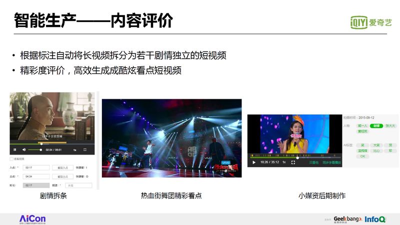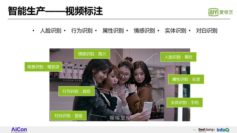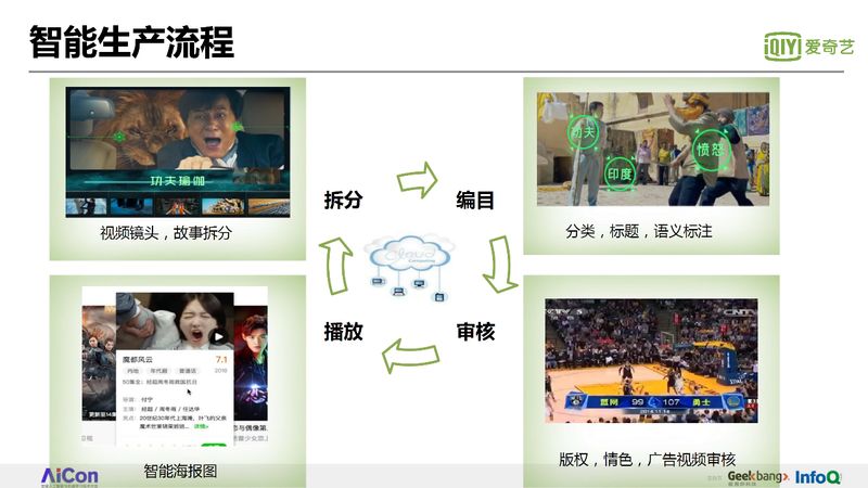 接下来是 AI 在生产流程里的应用。首先是是智能拆条,视频进来之后,把片头、片尾和广告去掉,其次是标注,就像把所有的商品打上标签一样,根据这个标签进行推荐和搜索。然后是审核,过滤盗版、情色等内容。最后是播放处理,比如自动生成封面和动态海报图,帮助对剪辑不熟悉的自媒体用户选取魅力封面图,也提高了海量视频的分发效率。目前爱奇艺首屏的每一栏目左上角都有动态的海报图,AI 会把视频的精彩的片段识别出来进行播放,帮助用户更好地选择视频内容。