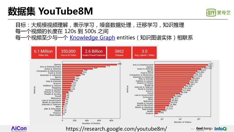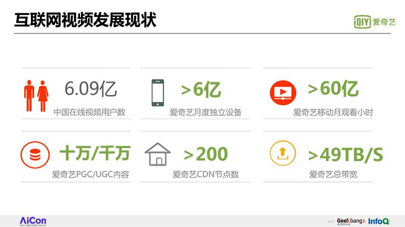首先,互联网视频行业的用户和数据量正在飞速增长。中国在线视频用户超过 6 亿,占全国互联网用户的 75%。仅在爱奇艺视频平台,用户月观看时长超过 60 亿小时,接近甚至超过了美国 Youtube 的观看时长。爱奇艺有十几万部 PGC 专业影视剧,千万级的 UGC 用户生成短视频,视频数据量巨大。此外,传递视频的网络带宽巨大,爱奇艺的总带宽达到 49TB。海量用户、视频和带宽,对我们的工作带来巨大的挑战,必须要借助 AI 进行有效的分析处理,才能够提高用户体验和生产运营效率。