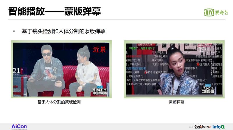 AI 蒙版弹幕,是一个神奇的应用。相比于普通弹幕,能够避免密集弹幕文字对近景人物区域的遮挡,降低了弹幕对用户观看视频画面的干扰。我们使用了基于深度学习的语义分割技术,引入镜头类型识别算法,识别出当前帧的场景类型,无明显人像主体类型的画面中不生成蒙版;而在特写、近景、中景等镜头画面中,生成人体掩码蒙版。播放时,随视频同步传输的蒙版文件“认为”是背景的图像区域上才会覆盖弹幕,因此弹幕不会覆盖到画面中的主体人像,提高了用户观看弹幕的体验。