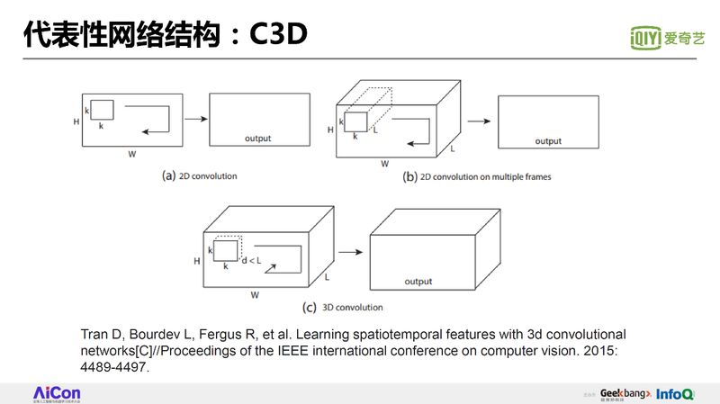 对于视频输入,3D 卷积可以提取视频的空间和时间特征。图中的 C3D (Convolutional 3D) 是代表性的 3D 卷积网络,使用 d×k×k(例如,3×3×3)的卷积核,d 是卷积核的时间维度的深度,k 是卷积核的空间 size。与 2D 卷积相比,标准的 3D 卷积不但要做空间卷积,还要做时域的卷积,计算量很大。
