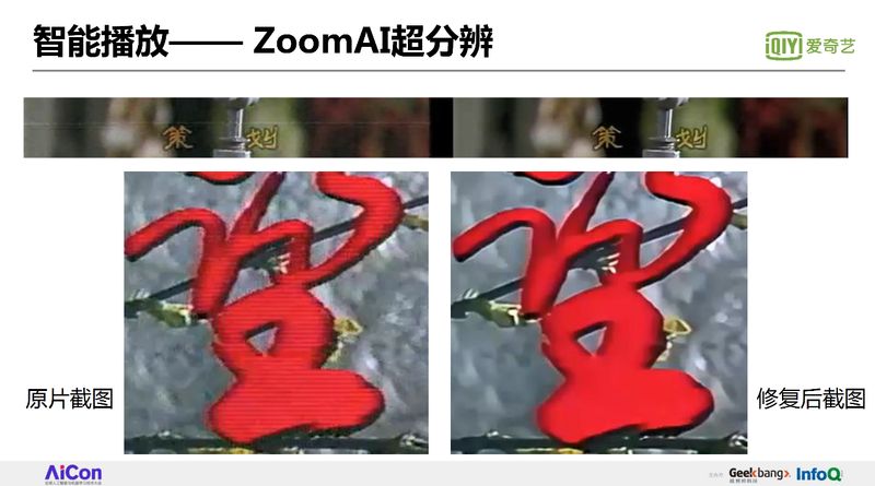 接下来介绍一下我们在视频播放方面做的工作。第一个是 ZoomAI 超分辨。上图为 80 年代非常火爆的电视剧《渴望》,但是现在你把这个片源拿出来在大屏幕上观看,会发现很多噪音、抖动,而且分辨率特别低。为了提高观看体验,我们研发了视频超分辨技术,通过深度学习把低分辨的视频恢复成高分辨的视频。另外还有画面破损修复的问题,上面左图有划痕、抖动,我们利用多帧图片的信息,通过多帧预测当前帧的图片,最后做一个融合,修复画面。上图左边的字边界比较模糊,右边的不但字很清楚,边界也特别清楚,这里我们不但考虑了两张图像之间的像素灰度值损失最小,而且还要加上梯度损失最小,从而优化了视频的纹理和边缘细节。