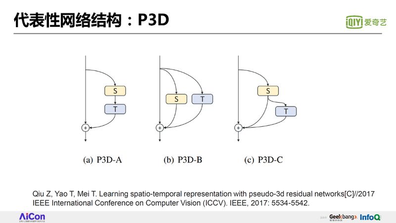 为了解决提高速度,微软团队提出了 P3D 模型。如前面提到的,3D 卷积核为 d × k × k 大小,d 是卷积核在时间维度上的深度,k 是卷积核的空间上的宽 / 高。对于 3×3×3 的 3D 卷积滤波器,可以将其解耦为 1×3×3 的卷积滤波器和 3×1×1 的卷积滤波器,前者等同于空间域的 2D CNN,后者看成是时间域的 1D CNN,这种处理就是 Pseudo 3D CNN 的思想。P3D 有三种结构,S 代表空间维度(spatial dimension)的 2D filters,T 代表时间维度(temporal domain)的 1D filters,第一种是 T 串行级联在 S 的后面,第二种是 T 和 S 并行,第三种是前两种结构的折中或综合。