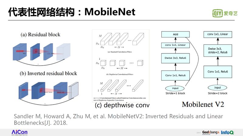 第二个代表性网络结构是 MobileNet V2,用于提高手机上运行模型的速度。这里主要用了两个技术,一个叫反向残差模块 Inverted Residual block,一个叫深度分离卷积 depthwise conv。如中间图所示,Depthwise Separable Convolutions 的基本思想是,把标准的卷积运算(每个卷积核的通道数与输入的通道数都相同),分解为两个步骤,第一步是 depthwise convolution,它对每个输入的通道应用单独的卷积滤波器(单通道卷积核),第二层是 pointwise convolution,使用 1*1 的卷积核,对输入特征的 channels 进行线性组合为新的特征。
