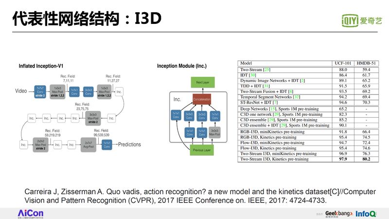 还有 I3D 模型,整个网络中的某一个模块,把 Inc. 的模块用中间这张图的 Inception 结构塞进去,从而把这个网变得更宽更深。
