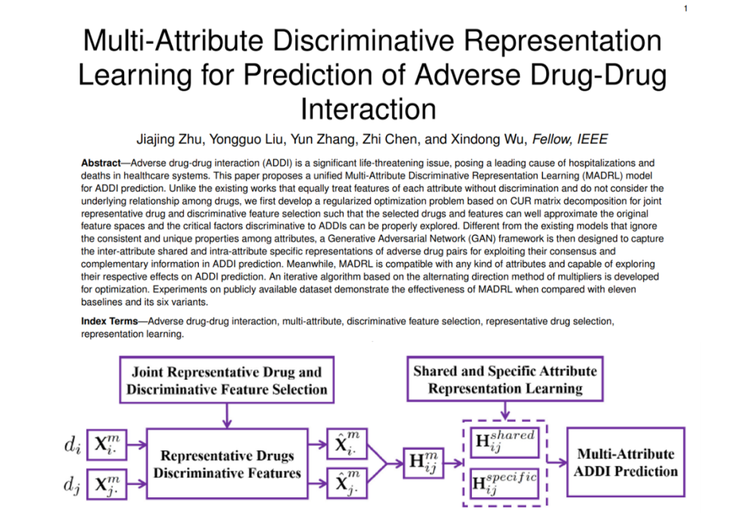 电子科大在IEEE人工智能、模式识别领域国际顶尖期刊《IEEE Transactions on Pattern Analysis and Machine Intelligence》(IEEE TPAMI)发表题为“Multi-Attribute Discriminative Representation Learning for Prediction of Adverse Drug-Drug Interaction”的研究论文。朱嘉静为论文第一作者,软件学院为第一作者单位和通讯单位,合作单位为北京明略科学院。该研究工作是软件学院作为第一作者单位和通讯单位发表的首篇IEEE TPAMI论文,也是该期刊首次刊登药物间不良反应预测模型论文。