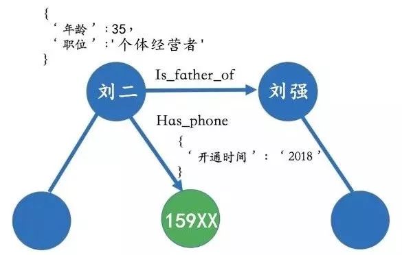 下面的图表示一个简单的属性图。刘二和刘强是父子关系,并且刘二拥有一个159开头的电话号,这个电话号开通时间是2018年,其中2018年就可以作为关系的属性。