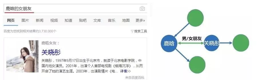 知识图谱应用的前提是已经构建好了知识图谱,也可以把它认为是一个知识库。这也是为什么它可以用来回答一些搜索相关问题的原因,比如在百度搜索引擎里输入“鹿晗的女朋友?”,我们直接可以得到答案-“关晓彤”。
