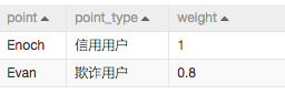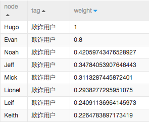 使用标签传播分类组件除了需要所有人员的通联图数据以外,还要有人员打标数据。本实验通过已知数据(读数据表)组件导入打标数据(“weight”表示目标是欺诈用户的概率),如下图所示: