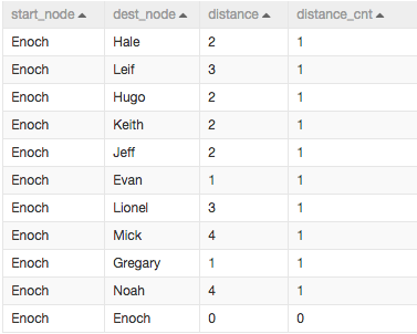 通过单源最短路径组件探查出每个人的一度人脉、二度人脉等关系。“distance”表示“Enoch”通过几个人可以联络到目标人,如下图所示: