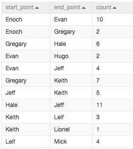 上图对应的数据集如下,上图是个有向图,每个点代表一个人,每个人都是一个start_point,每个start_point都连接一个end_point。count表示start_point和end_point的连线,count值越大说明start_point和end_point这两个人的关系越密切。